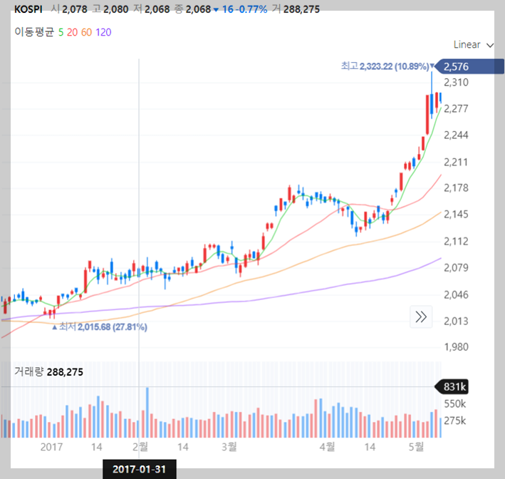 16년도 차트→ 1월달 하락 추세 이후, 설날 전 상승추세 이후 보합. 설날 이후 큰 갭하락 후 상승추세.