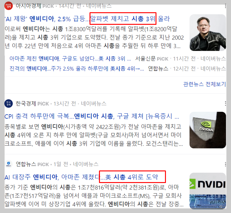 엔비디아는 이틀전 아마존을 제치고 시총4위로 올라섰으며, 하루 뒤 알파벳(구글모회사)도 제치며 시총 3위로 등극하였네요!!!