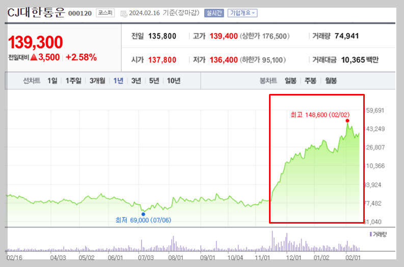 현재 물류배송 관련주는 최근 몇달간 상승이 높게 진행되었더라구요. 특히 CJ대한통운은 작년 11월 부터 약 100% 상승을 보이더라구요.