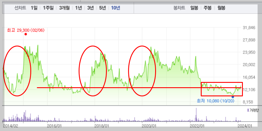 10년 차트를 보면 아직 큰 상승 없이 바닥 구간인 것을 볼 수 있으며,