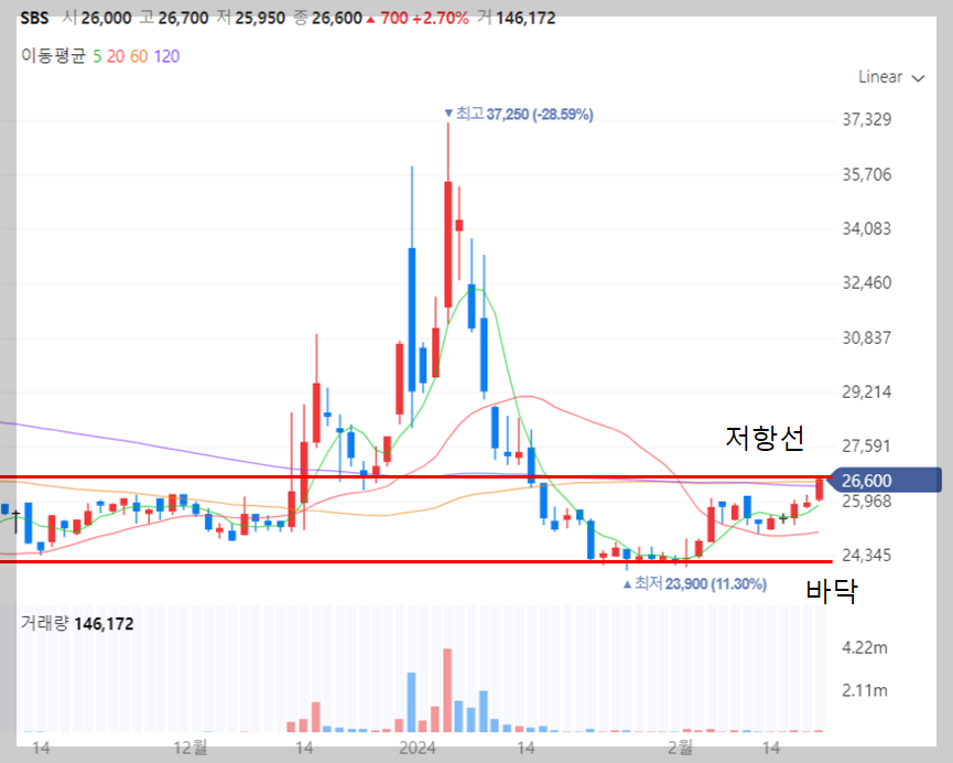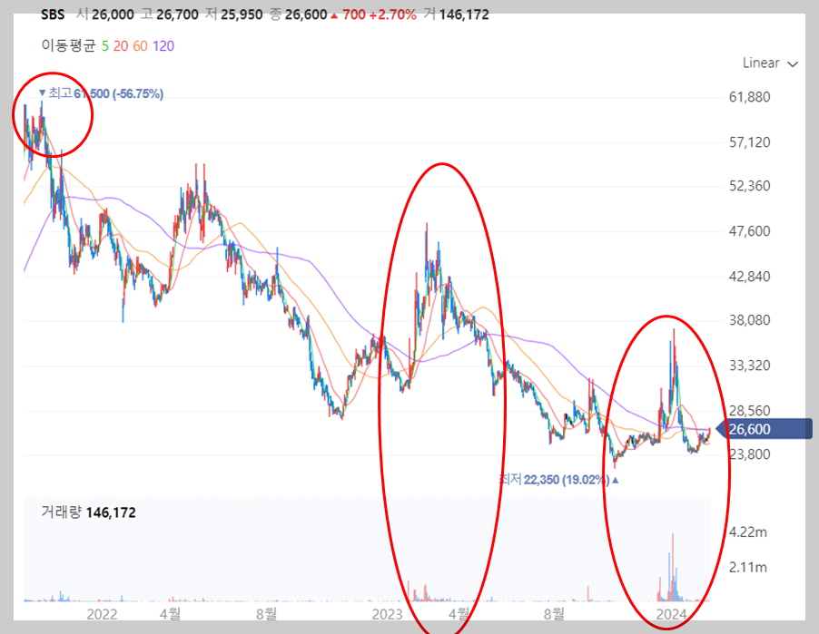 그리고 23년 3월 행동주의 펀드 얼라인파트너스가 SBS를 대상으로 주주행동주의 캠페인 벌인다는 이슈로 거래량 들어오며 상승하였지만 다시 하락.