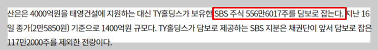 태영건설에 4000억원을 지원하는 대신 TY홀딩스가 보유한 SBS주식 1400억원치를 담보로 잡는다는 내용 이었습니다.