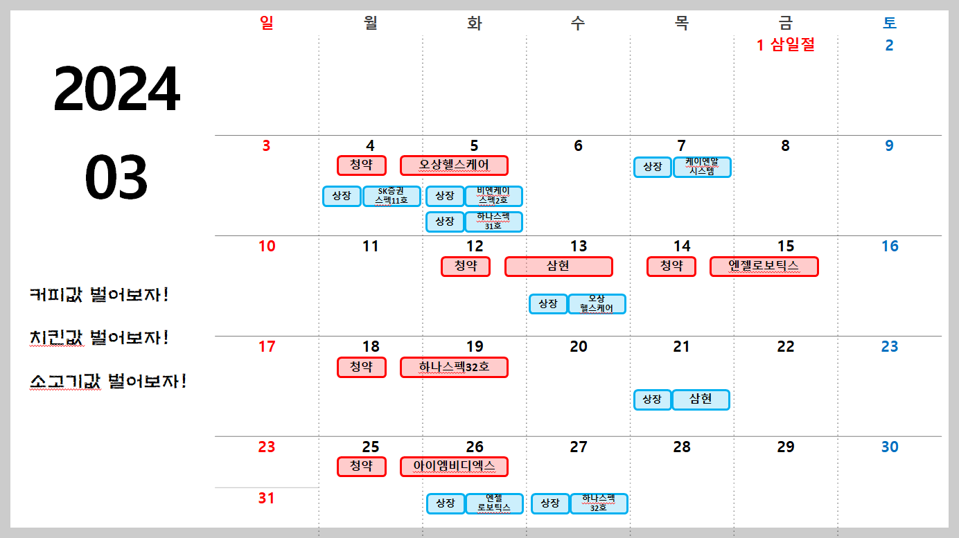 2024년 3월 공모주 청약, 신규상장 일정 달력
