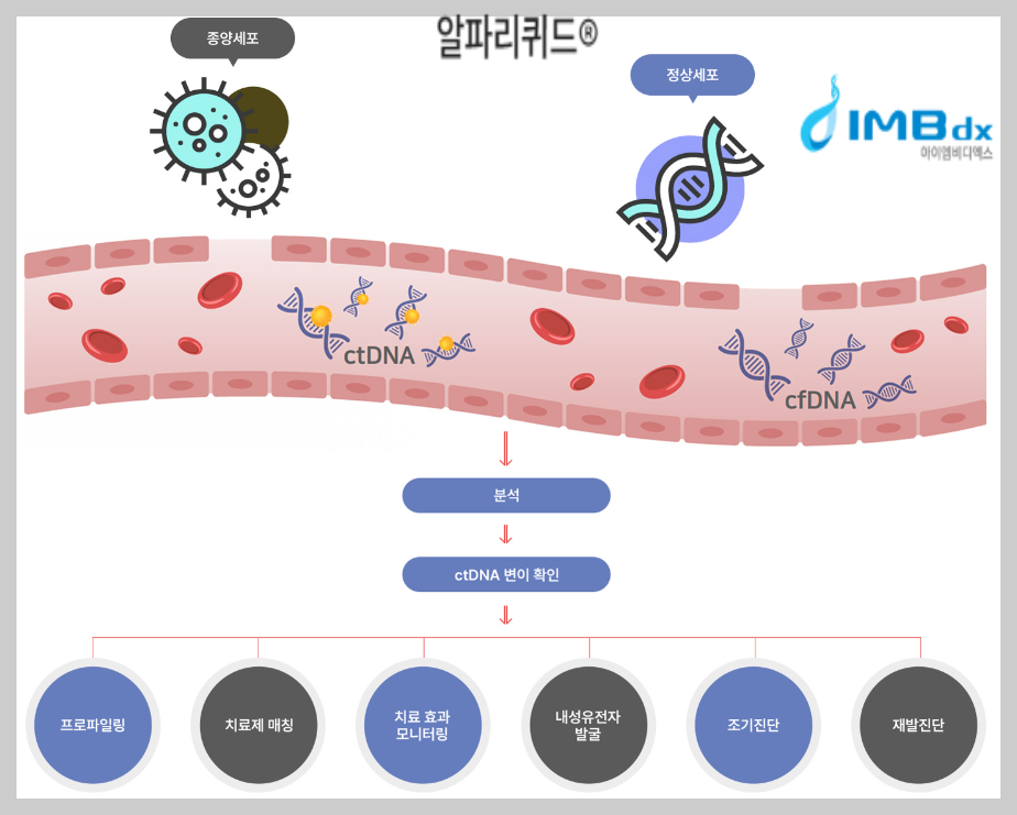 아이엠비디엑스는 채혈을 이용하여 종양 DNA의 다양한 유전자 변이 검사를 합니다.