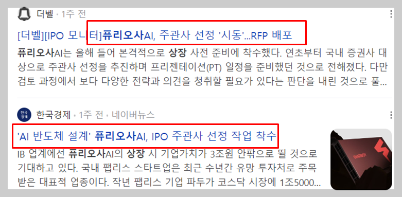 국내 팹리스 스타트업 AI반도체 기업중 하나인 퓨리오사AI가 3월달 상장을 위한 주관사 선정을 준비중 입니다.