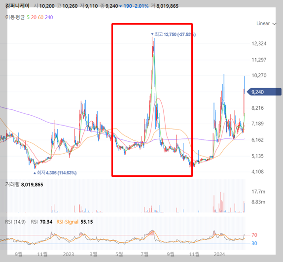 지난해 팹리스 기업 파두가 1조5000억원의 가치를 인정 받으며 상장한 적이 있으며, 이때 '컴퍼니케이' 종목이 급등을 보인 적이 있습니다.
