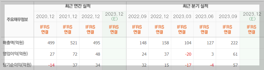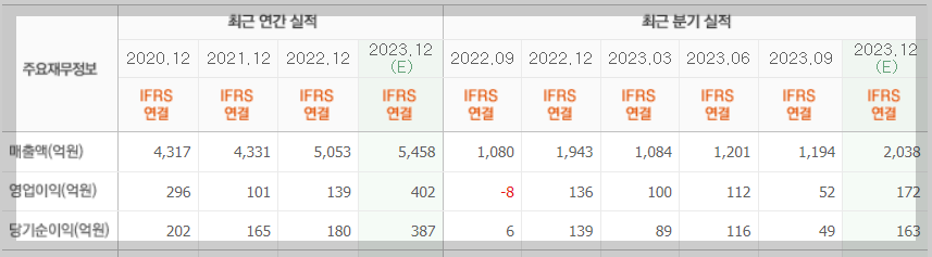 23년 4분기 당기순이익은 -14억 적자 였지만 대체적으로 매년 매출액과 영업이익이 증가 추세로 양호 합니다.