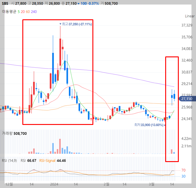 태영건설 위기관련 뉴스가 나옴에 따라 SBS주가는 240일선 위로 올라타면 24년 1월 고점까지 어느정도는 올라가지 않을까 생각중입니다.
