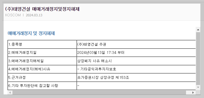 태영건설은 워크아웃 진행중 자본총액이 마이너스로 전환 되면서 완전자본잠식 상태에 빠졌고, 2024년 3월 14일 부터 주식 거래가 정지되었습니다.