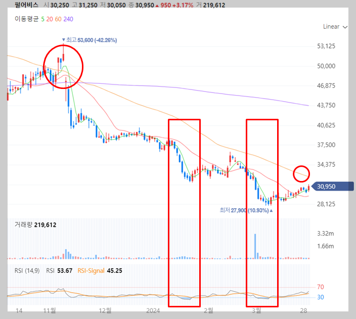 빨간색 네모 표시 한 부분과 같이 RSI지표 30이하 과매도 구간을 1월, 3월 두번이나 나타났으며, 최근 다시 반등을 보이며 상승 중에 있습니다. 오랜만에 20일선을 뛰어 넘었으며, 60일선 반등을 시도 할 것으로 보입니다.