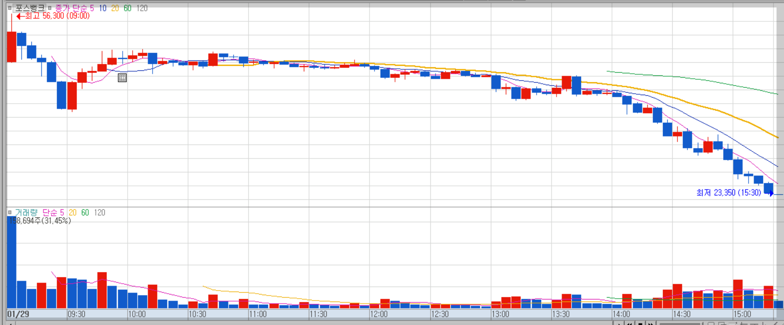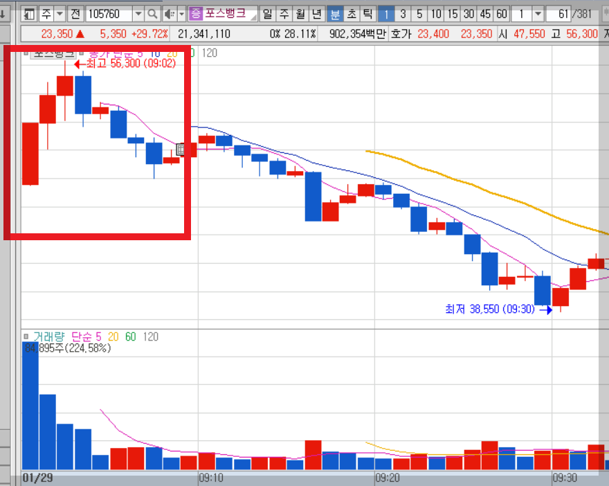 어제의 개인적인 포스뱅크 대응 방안 계획에서는 장시작과 함께 하락이 나온다면 이후 반등구간에서 매수를 노리는 것 이었습니다.
