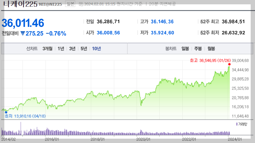 일본 니케이차트는 24년 2월 기준 최고점 근처에서 횡보중으로 어마어마 하네요.